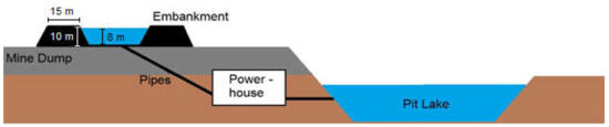 As a consequence of open-pit (or open-cast) mining, residual mining holes are created. One reason for this is the difference between gross production and usable materials. The other reason is that not all of the produced material is refilled into the pit but some is stored as mine dumps adjacent to the pit mine on account of the high costs of refilling as well as the dip of the coal seam, the latter requiring an ever-increasing volume to be moved during extraction [19]. For example, half of the mined area of Hambach will remain a residual mining hole. Most of these holes are flooded and become pit lakes [20]. The idea of a PSH power plant in an abandoned open-pit mine is to use this artificial lake in combination with the mine dump in order to store electricity. Currently, lignite is mined on twelve different sites in Germany [21].