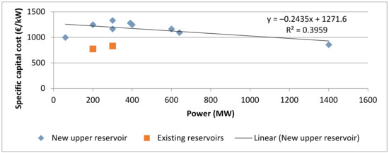 The specific investment costs of PHS can vary significantly (600–3000 €/kW) depending on the site-specific conditions [28,29]. The capital costs for the mechanical facilities of an open-pit mine PHS are comparable to the investment of other PHS power plants. The largest share is the powerhouse with 37%, followed by the upper reservoir with 19%, owner’s costs at 17% (these include paid-up royalties, preproduction costs, inventory capital, and land costs, cf. [30]), and engineering-, procurement and construction management services at another 17% [30]. It is part of a study by the U.S. National Renewable Energy Laboratory (NREL) in 2012 (figures converted using the official exchange rate of Sep 14, 2014 (US$1 = €0.7742; www.oanda.org). Summing up, the specific capital costs amounted to 1726 €/kW. The specific capital costs in a related study by [13] amount to 750 €/kW, which makes a difference of nearly 1000 €/kW. In order to obtain a reference value, the specific capital costs of a series of planned PHS projects (see Table 2) has been plotted with specific capital costs and power in Figure 3. The average of projects with only one existing reservoir is approx. 1100 €/kW. The specific capital costs for powerhouse, powerhouse excavation, tunnels and engineering, procurement, and construction management services are taken over proportionally by the values from [30] and are adapted to 1100 €/kW, which leads to power-related specific capital costs of 704 €/kW. The costs for the upper reservoir, owner’s costs, and other arising costs are assessed in this study and offer cost reduction potential. It is also reasonable to look at these two groups separately because the volume of the upper reservoir does not influence the power in kW but it does influence the capacity in kWh, and thus should be excluded for the power-related specific capital costs.