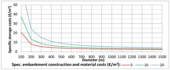Costs in € per m3 for the upper reservoir, by reservoir diameter.