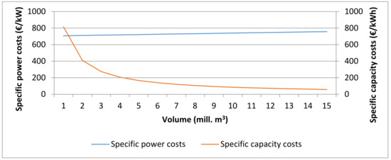 Summing up, the specific investment costs per kW and kWh depicted in Figure 5 were calculated as a function of storage volume for a construction with an installed power of 700 MW and embankment construction and material costs of 5 €/m3 (see Figure 4). The costs per installed power rise slightly with the storage volume, whereas the costs per unit of installed capacity fall rapidly. Compared to the Capex of other PHS projects reported in Table 2, the costs of an open-pit mine PHS are in the lower range.