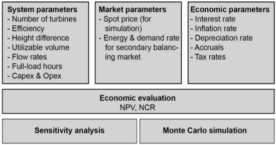 The results of the economic evaluation are presented in terms of net present value (NPV) and net cash recovery (NCR). Further, the robustness of the model results is scrutinized deterministically by means of sensitivity analysis and, probabilistically, also by running a Monte Carlo simulation. Figure 6 displays the setup of the economic model. In the following, the parameters are specified in tabular form.
