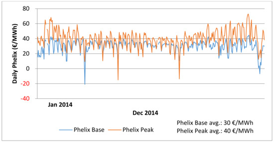 (a–c) EEX spot market prices, base-load and peak-load, 2012–2014. Source: own illustration, based on weekly EEX data (1 January 2012–31 December 2014).