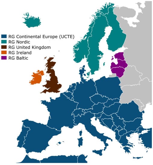 In Figure 2, we can see five regional groups (RGs) in Europe with a synchronous grid. A synchronous wide area network also known as a synchronous zone is a power grid of a regional scale or larger, operating on a synchronized grid frequency and electrically connected in normal system conditions, the strongest is the continental Europe synchronous network (ENTSO-E—the European Network of Transmission System Operators for Electricity) with 667 gigawatts (GW) of generation [45]. ENTSO-E is primarily meant to support optimal management and promote the reliable operation of the system on a European scale and to support development, in a sustainable manner, of the international electricity transmission system in EU. The organization is also responsible for ensuring security of supply and meeting the needs of the internal, unified electricity market [45,46].