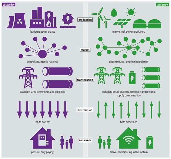 As was shown in Figure 4, producer-consumers (prosumers) can buy and sell electricity in what is called participation in the system in both directions. Prosumers can generate electricity either to meet their own needs only or generated surpluses to send to other users through transmission to the network. In the first case, we are dealing with off-grid prosumption, and in the second, on-grid prosumption [36,57,58]. Energy users will no longer just be simple electricity consumers but prosumers who produce energy through, for instance, photovoltaic panels installed on the roof or around their houses and using innovative equipment such as energy storage devices (i.e., batteries) [59]. To convert citizens into active consumers (prosumers), public authorities are responsible for creating the right, appropriate, and favorable regulatory and financial climate [60]. The new paradigm will also allow market liberalization and price formation and energy transfer beyond one zone, which is indicated in Figure 4 as decentralization and ignoring the boundaries. In order to integrate the systematically increasing share of energy from renewable sources, the future power system (market structure) should adapt to all possible sources of flexibility (many small power producers [61]), especially solutions regarding energy demand and storage, and thanks to the implementation and integration of innovative technologies into the power system that also use digitization. Significant development of energy storage systems and the latest energy storage technologies currently available (including electrochemical technologies, chemical and hydrogen energy storage, battery, thermal, thermochemical, compressed air, flywheel, pumped, and magnetic storage) has the chance to change the status quo, enabling its storage from seconds to weeks or months [59]. Electricity storage is the key to solving the problem of using renewable sources. As wind, water, and sun only generate electricity when weather conditions (changeable and unpredictable) permit, they must be integrated into an efficient energy storage system [6,62]. In this case of many different unforeseeable energy sources that are used, coordination and timing of energy supply and demand in a continuous manner in many complementary energy systems should be developed [19]. Today, most of the energy infrastructure is not digitalized at all, as digitalization in the energy sector is still in its infancy [63], so bringing new technologies and ideas into a tightly regulated sector is challenging for the energy sector. The digitization and automation of the elements belonging to the distribution network, as well as the quick and efficient integration of renewable distributed energy sources (DERs) with the grid, fundamentally changes the dynamics and requirements of the power sector. Due to the high volatility and uncertainty of energy production through DER, special attention is paid to the possibility of using flexible loads and smart meters to improve system reliability [64]. New technologies in the range of digitalization will have on the future energy system. Digitalization will support an increasingly automated and digital energy sector [8]. Big data, innovative machine learning, artificial intelligence processes, the Internet of Things, and distributed ledger technology (DLT) are now known in the scientific community as blockchain [65,66]. Distributed ledgers are relatively new, and not without significant challenges. As more and more attention is paid in the energy industry to researching more diffuse models, including peer-to-peer trading, microgrids, and local demand response, DLT can play a key role as a driver of interactions without the need to involve a central authority [51,67].