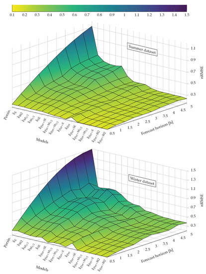 Forecasts of GHI obtained at different time horizons are compared to enable the assessment of the models’ global performance. The persistence model is used as a reference. For all the OGPR models catalogued in Section 5.1, the nRMSE vs. the forecast horizon is displayed in Figure 1. Further numerical results for the summer dataset (Table A2 and Table A3) and the winter dataset (Table A4 and Table A5) are presented in Appendix B. Broadly speaking, there are three classes of models, each possessing a different performance level. The worst performance is exhibited by the persistence model, and improved performance is witnessed when using OGPR models based on simple kernels; lastly, considerably better performance is exhibited by OGPR models based on quasiperiodic kernels, particularly considering higher forecast horizons.