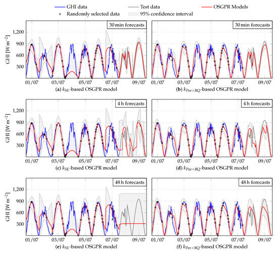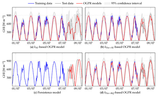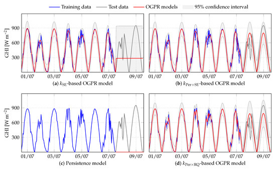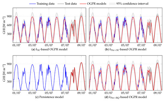 However, OGPR models based on quasiperiodic kernels—these kernels combine a periodic kernel with a non-periodic kernel–possess the advantage of the periodic kernel, while still managing to predict rapid changes in GHI during the day. Among quasiperiodic kernels, surpasses other kernels for the summer dataset, with , and all coming in a close second (see Table A2); for the winter dataset, however, there is no clear best-performing kernel, as those four kernels alternatively take the first place (see Table A4).