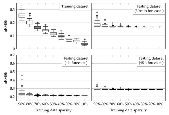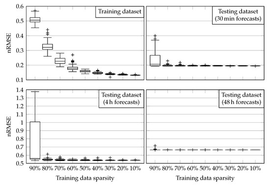Recall that, while each data sample is used during training, during testing, a new observation is added to the observation set only each whole multiple of the forecast horizon. This means that, first, for all three figures, the training results are identical; second, the coefficients in Equation (16) are updated every 30 in Figure 2 and every 4 in Figure 3, while for the 48-h forecast horizon, no update occurs.