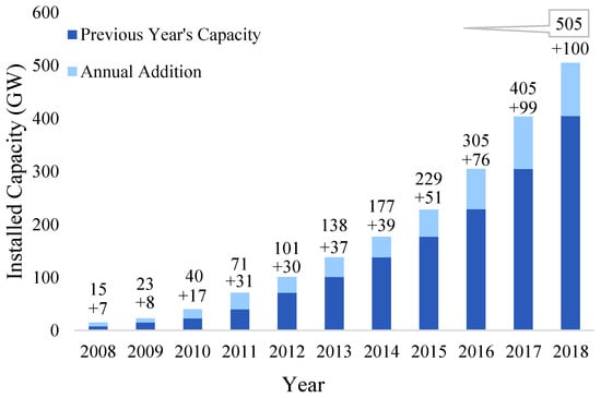 Renewable energy (RE) plays a pivotal role in supporting the power system to meet the ever-increasing load demand. Among the renewable energy resources (RES), photovoltaic (PV) power units are gaining more interest due to (a) clean and emission free energy, (b) simple access, and (c) high return on investment [1]. Up to the year 2009, the majority of PV installations were made at a small level and were only connected to the distribution level. However, when the USA installed the first transmission level (230 kV) PV system in Florida [2], it drew the world’s attention. Therefore, the interest in large scale PV installation (transmission and sub-transmission levels) increased rapidly and as a result, globally the installed capacity of PV reached 505 GW by the end of 2018. The total installed capacity of PV from 2008–2018 is presented in Figure 1. The figure shows a dramatic increase in PV installation as in 2008 the installed capacity is 15 GW, and it increases to 505 GW at the end of 2018 [3].