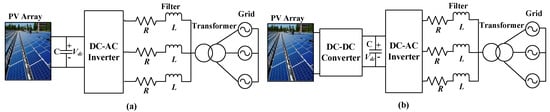 Depending on the conversion system, two types of configuration systems are used for grid-connected PV power plants (GCPPPs), i.e., single and two stage conversion/configuration systems. A configuration is said to be a single stage, when there is a direct connection between the inverter input side and the PV array and is then connected to the grid through the transformer as depicted in Figure 2a [4]. On the contrary, if a DC–DC converter is utilized to integrate the PV array with the inverter’s input side then the configuration is said to be a two stage as presented in Figure 2b [4]. It shows that in both configuration systems, inverter plays a significant role in integration and