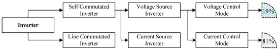 A MOSFET or IGBT devices are usually used in SCI. MOSFETs are used for high frequency (20–800 kHz) applications having power ratings less than 20 kW. On the contrary, IGBTs are used for low frequency (20 kHz) applications having power ratings greater than 100 kW. The commutation operations of these switches are fully controlled through the gate terminal [38]. Therefore, it controls both the current and voltage output waveforms. High switching frequency devices are preferably used in grid-connected applications to reduce the inverter weight, filter size, and output waveform harmonics [39]. Moreover, SCI improves the grid power factor, suppresses the current harmonics, and shows high robustness to the grid disturbances. Due to the development of sophisticated switching devices and improvement in the control strategies, SCIs are preferably used as compared to LCI. The SCIs are further classified into current source inverter (CSI) and voltage source inverter (VSI).