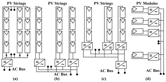 Configuration of grid-connected PV inverters: (a) central; (b) string; (c) multi-string; and (d) AC modules [45].