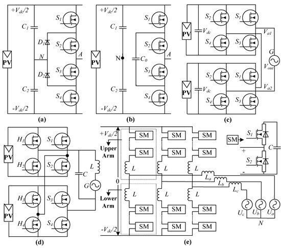 Power circuitry of grid-connected multi-level inverter (GCMLIs): (a) 3-level neutral point clamped (NPC) [53]; (b) 3-level flying capacitor (FC) [54]; (c) 3-level cascaded H-Bridge (CHB) [59]; (d) 9-level CHB with FC [11]; and (e) 3-Φ modular topology [65].