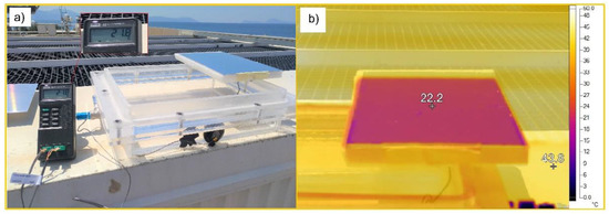 Comparative temperature test between CM and identical plate without coating exposed to clear sky conditions: (a) photo, (b) data.