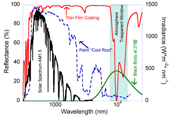 Reflectance spectra in the wavelength range 250 to 16,000 nm of simulated multilayered cool metamaterial (CM) (red line) in comparison to a simple cool roof paint (blue line), reported with Solar Spectrum AM1.5 irradiance (dark line) and black body irradiance at 27 °C (green line).