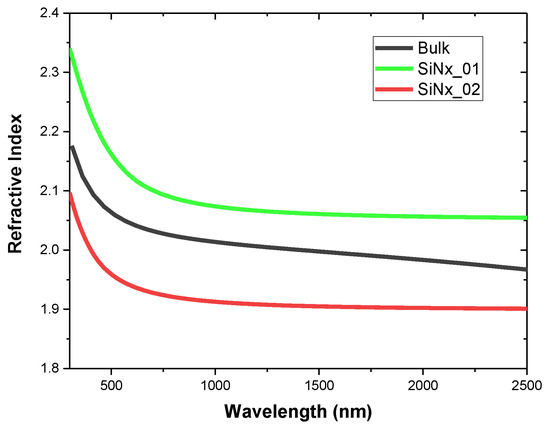 Refractive index of two silicon nitride thin layers compared to bulk one.