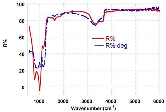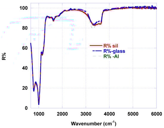 In Figure 6, a comparison between CM FTIR reflectance of CM, as deposited on different substrates by means of the same sputtering process is reported. It is remarkable the high reflectance in a large part of infrared range (>95% from 2000 to 6000 cm−1) and the strong absorption (and, hence, emission) in 670–1300 cm−1. Only few differences between metamaterials, as grown on different substrates in infrared reflectance spectra, are detectable, because reflective behavior of such metamaterial in this range is heavily influenced by the 200 nm silver layer. The absorption band (670–1300 cm−1) is identical in all different samples. A difference can be detected in the hydrogen bonds absorption band around 3300 cm−1, lied to –OH groups and around 3600 cm−1 lied to –NH groups and influenced by water content.