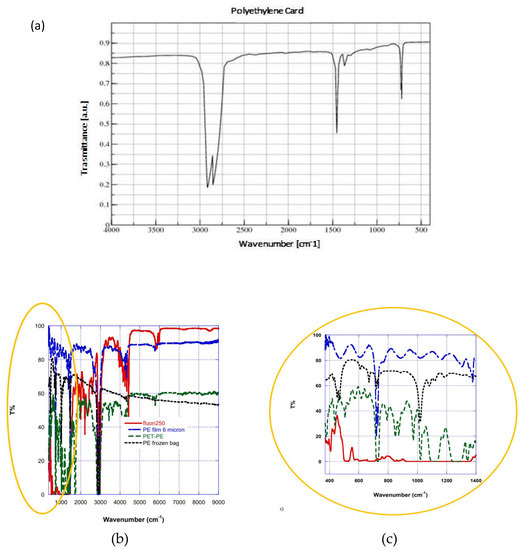 FTIR transmittance spectra of different polymeric thin films for selecting cover material. (a) Book spectrum of polyethylene card; (b) full range spectra of Fluon 250 (red line), PE film 6 micron thick (blue line), PET-PE (green line), PE based freezer bag (dark line). (c) Insert containing the interest region (769–1250 cm−1), where the most transparent polymer is the blue-one line.