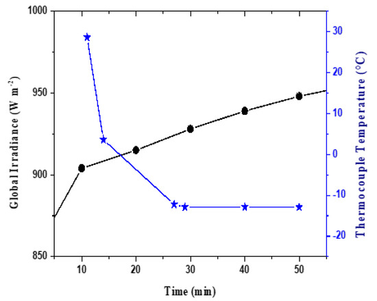 The first experimental test on the prototype was conducted in June 2019, on a rooftop of the ENEA Portici Lab. In a preliminary phase of the test, the prototype was positioned on a rooftop, with thermocouples measuring metal radiator temperature and air temperature (as described in Scheme 1a): no temperature decrease of CM was observed, rather a little overheating. Subsequently, the polymeric cover was removed from the box, to avoid greenhouse effect, and the experiment was repeated on the metallic plate exposed directly to air, positioned on the casing but without cover. The plate temperature, measured on the underside of the heat exchanger, after 2 min went well below the air temperature, approximately of 12 °C, even under direct solar irradiance staying unchanged for the duration of the test (1 h), as shown in Figure 8.