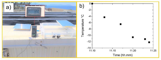 Anyway, having extracted CM from the box (and consequently having only measured the CM thermal behavior and not the entire prototype performance), another shorter test was executed to confirm the metamaterial ability to reach temperatures lower than the ambient one. In particular, the temperature difference (ΔT) occurring between two metallic identical plates exposed to clear sky conditions, one of which covered with metamaterial, was measured positioning two thermocouples as represented in Scheme 1b. In Figure 9, the maximum temperature difference measured (a) and the temperature course (b) are reported. As shown in Figure 9, the CM was able to reach a temperature 12 °C lower than its substrate.
