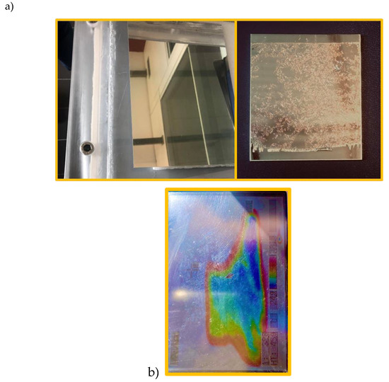 The CM exposed to the air after the test started to partly peel off from the metallic slab substrate edges. The peeling process that initially started in the edges region (Figure 10b), after 1 month of air exposure (Figure 10a), appeared uniform on the entire slab. Pink regions, entirely delaminated from substrate, are visible in Figure 10a. Such behavior is not detectable in samples deposited on different substrates (produced for analytical purposes).