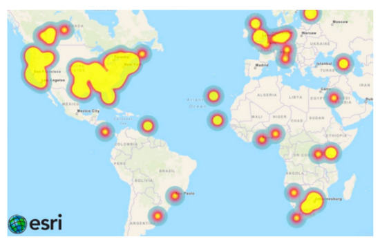 Heat map highlighting locations where power outages occurred across the globe [15].