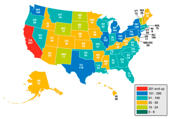 From Figure 2, it can be seen that the number of power outage events occurred are different for each state in the USA The least number of power outage events occurred are eight in Rhode Island, and the maximum number of power outage events occurred are 537 in California. As per the United States Department of Energy (US DoE) statistics, during one such major power outage, at least 50,000 customers have been impacted, and approximately 300 MW unplanned firm load loss is experienced [17]. Moreover, these power outages will have a significant impact on society, residential, and industrial operations. The effect would depend upon the frequency of power outage occurrence at a particular location. From Figure 2, it is clear there is a significant impact in most states of the USA, and hence there is scope for researching on improving the resilience of PSS, so that, the REUs are ensured with adequate power supply.