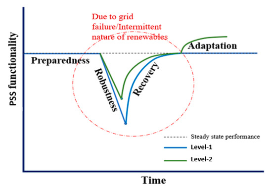 For understanding the resilience of the PSS configuration, a well-structured framework is necessary. The proposed framework should ensure that the system can sustain, recover, and adapt to the power outages or any other disruptive events. In this study, the proposed framework has four components, namely; preparedness, robustness, recovery, and adaptation [13,14]. These four components are clearly presented and depicted in Figure 3.