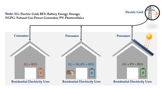 Schematic view of the proposed three power supply system configurations for residential electricity users [Note: EG—Electric grid; BES—Battery energy storage; NGPG—Natural gas power generator; PV—Photovoltaics.]