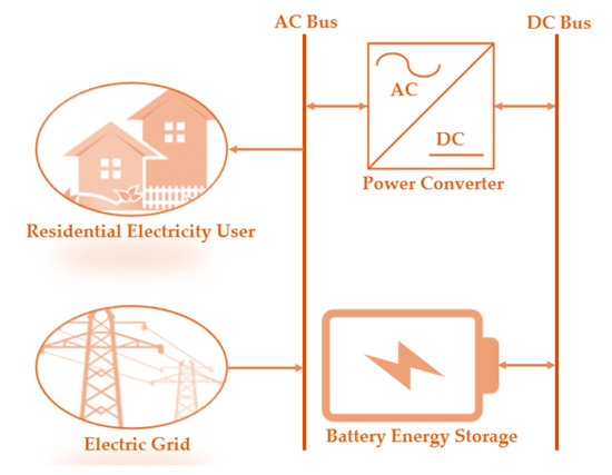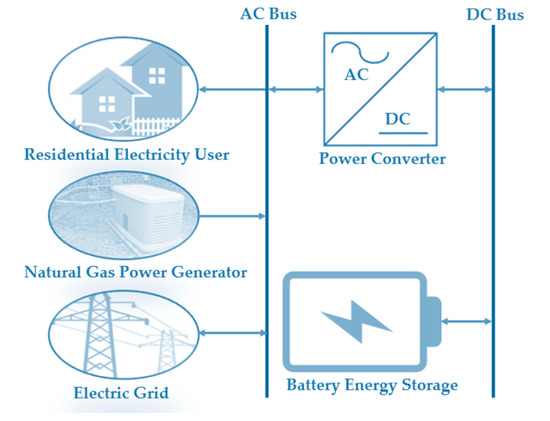 In Figure 5, a PSS configuration for a REU under the consumer-only category is shown. In this PSS configuration, the REU will only consume electricity that is coming from the electric grid for operating the residential electrical loads (which means there is no on-site energy generation facility). The main equipment in this configuration are the electrical loads, power converter, BES, and EG. These components are connected in the PSS network of an REU, considering both the alternating current (AC) bus and direct current (DC) bus. The AC load bus was linked to electrical loads and EG, while the DC load bus was linked to BES. Both the AC and DC load buses were connected through the power converter. Here, the power converter is mainly used to regulate and convert the DC power outputs to AC and vice versa. From the resilience point of view, the main aim of each REU is to prepare for power outages. In this PSS configuration, the REU is already prepared for power outages. As a preparedness measure, a backup power facility employing a BES within the electricity supply network of an REU is taken.