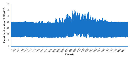 The electrical loads that consume energy are the most common type of equipment that we see in REUs. The most seen electrical loads are broadly categorized based on their nature that may be resistive, inductive, and capacitive. The typical examples of residential electrical loads are lights, fans, computers, cooking facilities, heaters, pumps, air conditioners, etc. In this study, we have considered the realistic electrical loads of a residential building located in a humid subtropical ecosystem is considered. The data related to electrical loads are obtained from the Open EI Database for load profiles [27]. The detailed load profile and its discussion is given in Section 4.