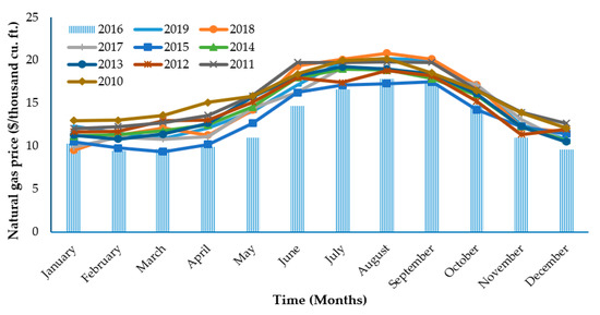 - Monthly Average Price of Natural Gas—Residential, U.S. Department of Energy, Energy Information Administration “Natural Gas Navigator” Historic Price Series. Available online: http://eia.doe.gov/dnav/ng/hist/n3035ny3m.htm (accessed on 12 June 2020).