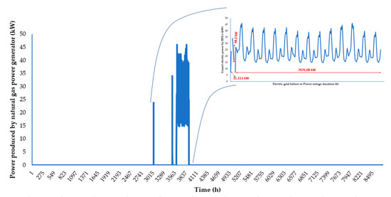 The supplied energy by the natural gas power generator represented using is given by multiplying the electrical power output with the operating time, t in h, see Equation (5).