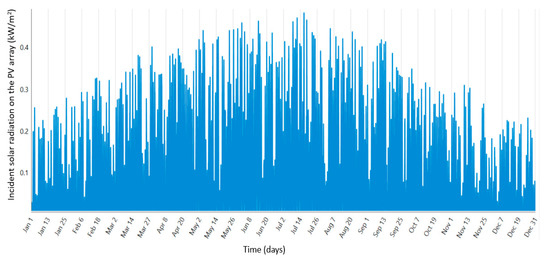 The supplied energy by the photovoltaic power generation system is represented by multiplying the electrical power output with the operating time, t in h, see in Equation (8):