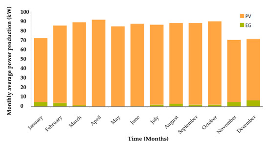 Share of power production EG + PV + BES based power supply system configuration [Note: EG-Electric grid; PV-Photovoltaics; BES-Battery energy storage].