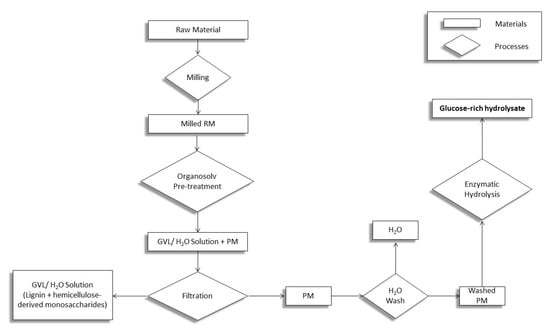 Thanks to their availability and no competition with the food chain, lignocellulosic biomass represents an interesting raw material (RM) for the production of energy and chemicals []. Lignocellulosic biomass is naturally recalcitrant to enzymatic deconstruction and microbial fermentation, and an effective pre-treatment is required prior to any further conversion into biochemicals and biofuels [].