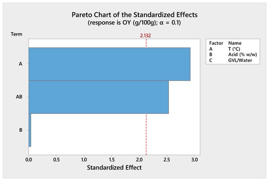 The most important effects and their relative magnitude on the OY response can be observed in the Pareto chart (Figure 2). As previously mentioned, two main effects were statistically significant (α < 0.1): temperature (A) and acid concentration by temperature (AB). The largest effect was temperature because it extends the farthest. The interaction effect (temperature by acid concentration) indicates that the relationship between temperature and the OY response depends on the value of acid concentration, as well as the relationship between acid concentration and the OY response depending on the value of temperature.