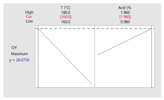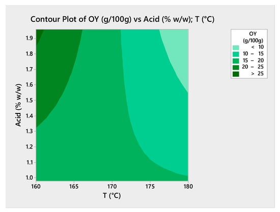 In Figure 3, an OY response higher than 25 (g/100 g) can be observed when the lowest temperature (160 °C) and highest acid concentration (1.96%) were used in the pre-treatment process. On the contrary, another respectable OY response, ranging from 20 to 25 (g/100 g), can be obtained by increasing the pre-treatment temperature up to 168 °C and lowering the acid concentration up to 1.3%. These observations are confirmed by some studies where it was shown that the use of an acid catalyst in the pre-treatment reduces the process temperature, delivering an enhanced CD and CR [,].