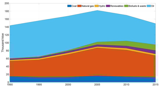 Energy mix of the primary energy supply, own analysis based on data from the International Energy Agency (IEA) [13].