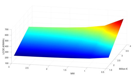 Given the fact that one specific device is proposed here, LCoE will be mostly a function of CapEx. As the installed capacity increases, the LCoE sees a reduction. The lowest LCoE 185.80 €/MWh is for 3 MW installed capacity, with a total CapEx 1,500,000€ and maintenance 162,000 €/year. The highest LCoE is 627.05 €/MWh when the cost per MW is 3,000,000€, and for a 0.5 MW configuration total costs scale to 10,800,000 and 324,000 €/year maintenance, see Figure 5.