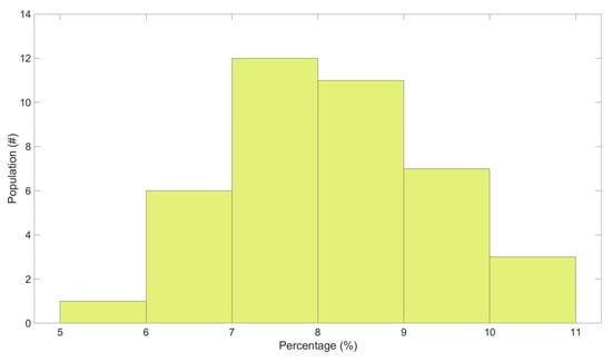 Another under-estimated characteristic is the beneficial mis-match of operation with other renewable energies. This in fact can enhance the utilisation of energy by renewables, whilst minimizing expensive solutions as batteries, which for industrial solution can be as high ≈1000 €/MWh (as stand-alone solutions), and from ≈280–360 €/MWh (as part of storing electricity by photovoltaics) [55]. Besides the aggregated annual energy performance, the hourly power production was analysed, and a filter was applied to focus only on hours that photovoltaics do not produce (from 6:00 p.m.–8:00 a.m.). The minimum hours operated in this timeframe of non-sunshine, the lower value was in 2005 with 5.85% in total hours, the maximum was 10.72% in 2000, with mean power production in such hours representing 8.25%. The density plot (see Figure 6) complements these findings, with the potential distribution being within the range of 7–9%.