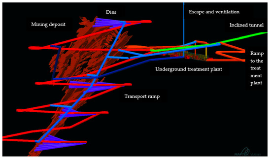 From the hydrogeological point of view, the uranium deposit of Kuriskova is below the local erosive level. The collector complex of rocks (andesite) is characterized by low permissibility, with dominant fracture permeability. Due to this, from the aspect of the future use of the deposit, the limiting factor will be the degree of draining of numerous fracture structures, which are also a source of fractured water springs on the surface in the vicinity of the deposit. The overall hydrogeological attitude is evaluated as simple (2nd degree of difficulty) [63]. The company Tetra Tech, Ltd., Golden, Colorado conducted a partial study that found that the main points of PFS were an initial rate of return of 30.8%, a 1.9-year payback, a net present value of USD 277 million at an 8% discount rate (pre-tax, base case assuming prices of USD 68/lb U3O8 and USD 15/lb Mo). Indicated resources total 28.5 million pounds of U3O8 (10 960 tU) and inferred resources amount to 12.7 million pounds of U3O8 (4 885 tU), using a cut-off of 0.05% U. It is important to note that the lifetime of mining operating costs are USD 22.98/lb U3O8 (USD 59.75/kgU), assuming a net molybdenum credit of about USD 1.27 per pound of U3O8 (USD 3.30/kgU). The project can be developed as an underground mine and a processing facility that would utilize conventional alkaline (non-acid) processing [64]. The method of the deposit opening was proposed by Tetra Tech Ltd. company in the final technical report for Kuriskova (June 2012), where the opening was chosen by a winze and two spiral ramps. The proposal of the deposit opening is shown in Figure 3. According to this proposal, the deposit is opened by the winze 2.6 km long with a cross-section of 6 × 6 m and 9.5% of decrement. The winze is further connected by two spiral ramps with a cross-section of 5 × 5 m and a degree of decrement about 10–12%. The first ramp is an opening work for the construction and access to an underground treatment plant. The second ramp is designed to access the deposit in its foot-wall and along its entire guide length. Transverse ditches will be gradually excavated from the ramp into the mining blocks [63].
