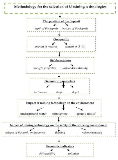 Therefore, a proposal for the extraction of uranium reserves at the deposit of Kuriskova was made for the purposes of this research. Based on it, it is possible to determine the amount of recoverable uranium reserves from the deposit. The methodology (Figure 4) of this mining proposal was determined to take into account the basic criteria of uranium deposit mining, which was used for the selection of suitable mining technology for the Kuriskova uranium deposit.