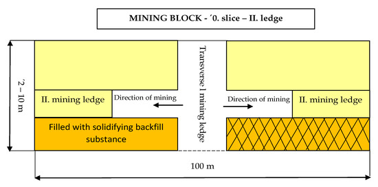 Mining will be carried out in mining blocks whose dimensions have been designed to 4 × 4 × 100 m with this mining method. The mining process in a mining block can be divided into 4 phases (Figure 5). The initial phase is focused on breaking down the transverse central mining ledge, the implementation of which can be obtained the necessary information about the quality and thickness of the ore body in a block. The second phase is mining of the first directional ledge on both sides of the ledge. During the third phase, the extracted spaces are backfilled with a solidifying backfill substance. At the same time, mining in the second directional mining ledge can be prepared. After the backfill has hardened sufficiently, the second mining ledge is mined, which is also filled with the solidifying backfill in the next phase. In the case of a larger thickness of the body in a mining block, it is possible to proceed with the mining and foundation of another mining ledge after the backfill has hardened in the second mining ledge.