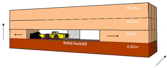 By alternating the mentioned basic phases of the cut and fill mining, all mining blocks will be mined and backfilled at the zero level. Subsequently, it can be progressed with the mining level up to the next slice and the whole ore body is mined by this way (Figure 6).