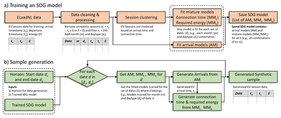 In what follows, we define (i) the arrival model (), (ii) the mixture model for connection times () and (iii) the mixture model for required energy (). Trained SDG models can be used to generate a sample of data. Data generation is a two step process.