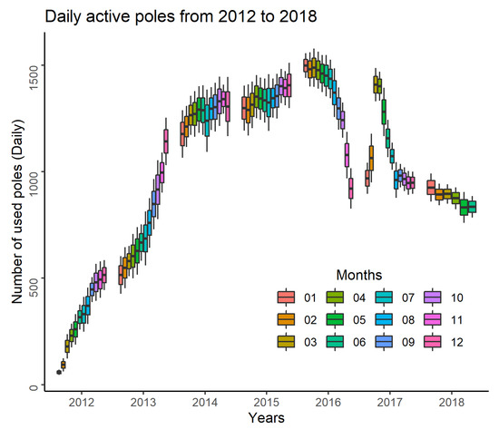Number of used poles per day, from 2012 to 2018. Each boxplot represents data for 1 month. The y-axis represents the number of daily active poles.