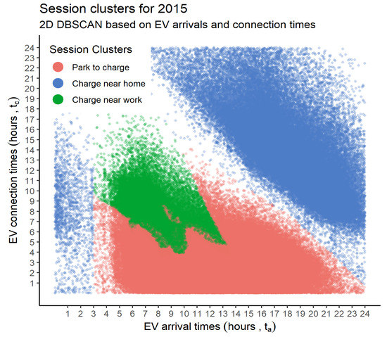 Sessions clusters: In our previous work [2], on the same data, we discussed three types of sessions. Namely, (i) Park to charge: arrivals throughout the day; (ii) Charge near home: arrivals during evenings, and staying till late at night; (iii) Charge near work: arrivals during early morning, and staying till evenings. The largest cluster was the park to charge cluster (60% of sessions), followed by the charge near home (29% of sessions) and the charge near work clusters (11% of sessions). The DBSCAN algorithm was used to determine these clusters, which is a density based clustering algorithm. We could see a similar distribution of sessions in the 2015 dataset, after clustering the sessions. The resulting session clusters are shown in Figure 3. These clusters are only based on 2015 data, contrary to the previous work, which combined the full data for 2012–2016. Please refer to [2] for further details.