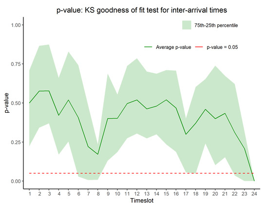 KS test p-values: For each combination, 24 KS tests were performed for each timeslot (). High p-values indicate that null hypotheses (IATs are exponentially distributed) could not be rejected.