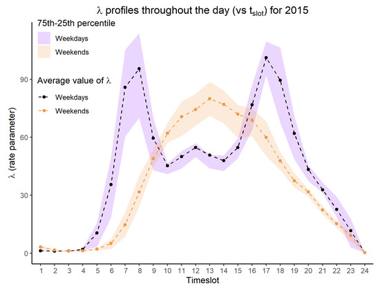 In IAT models, the time of the next EV arrival is the sum of the time of previous EV arrival and randomly sampled . As previously stated, this dependency becomes troublesome if is very large (due to the low , the next EV arrival may be very late, skipping a large time interval) or very low (high , large number of EV arrivals in a small amount of time). Due to that, fitting as a function of t requires caution in IAT models. However, we do not face this problem when using the AC modeling approach, wherein the number of arrivals are generated separately for each . Indeed, a low/high in the previous will not affect the number of arrivals in next . For practical uses, we can also assume that night hours with low numbers of EV arrivals are similar, and combine = 1–6 into a single timeslot. The fitted value of is then associated with the time from 00:00 to 06:00.