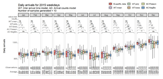 Daily aggregated EV arrivals (2015, weekdays). Significance was calculated based on Wilcoxon tests (ns: not significant, p-value > 0.05; * p-value ≤ 0.05; ** p-value ≤ 0.01; *** p-value ≤ 0.001; **** p-value ≤ 0.0001).